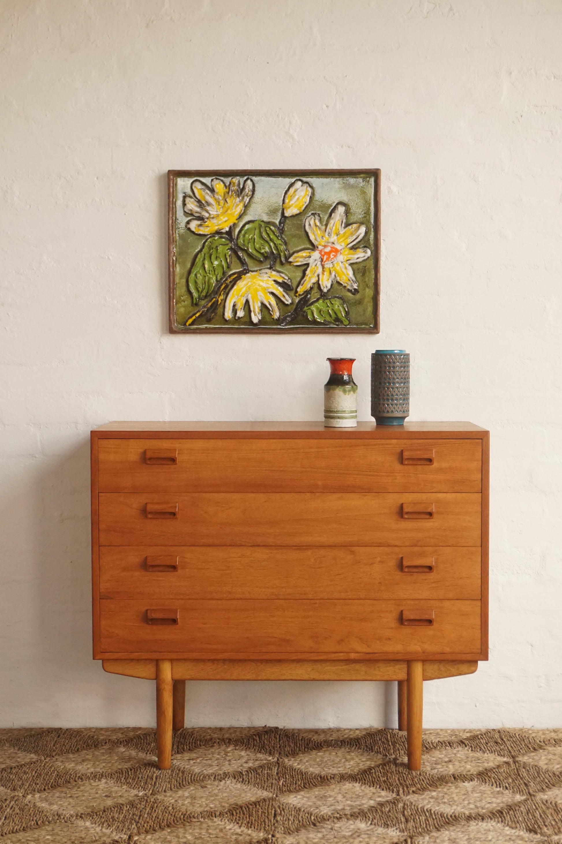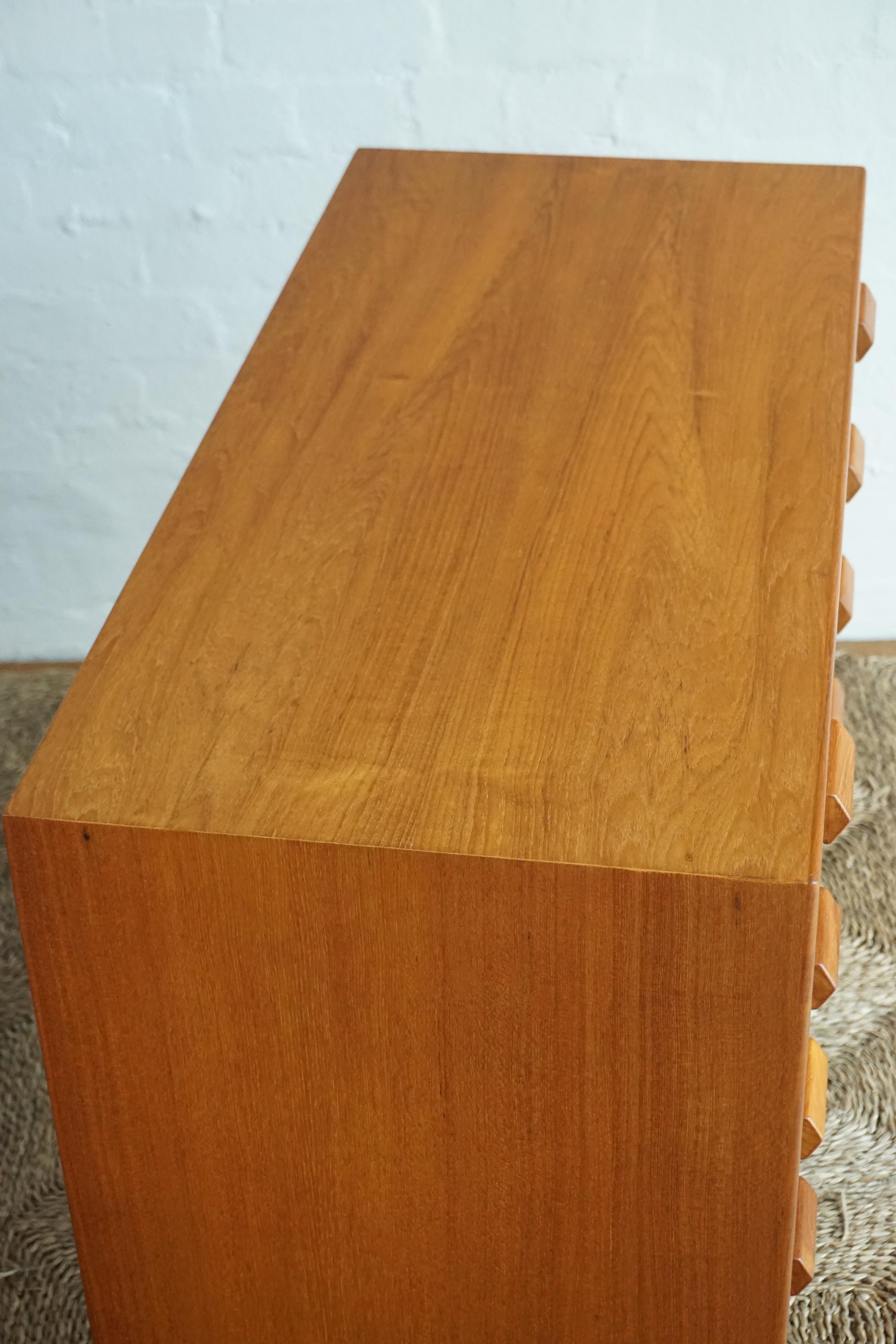 Teak with solid oak base and legs. The chests have been fully restored, sanded, polished and finished with matte Osmo oil. Lovely condition.