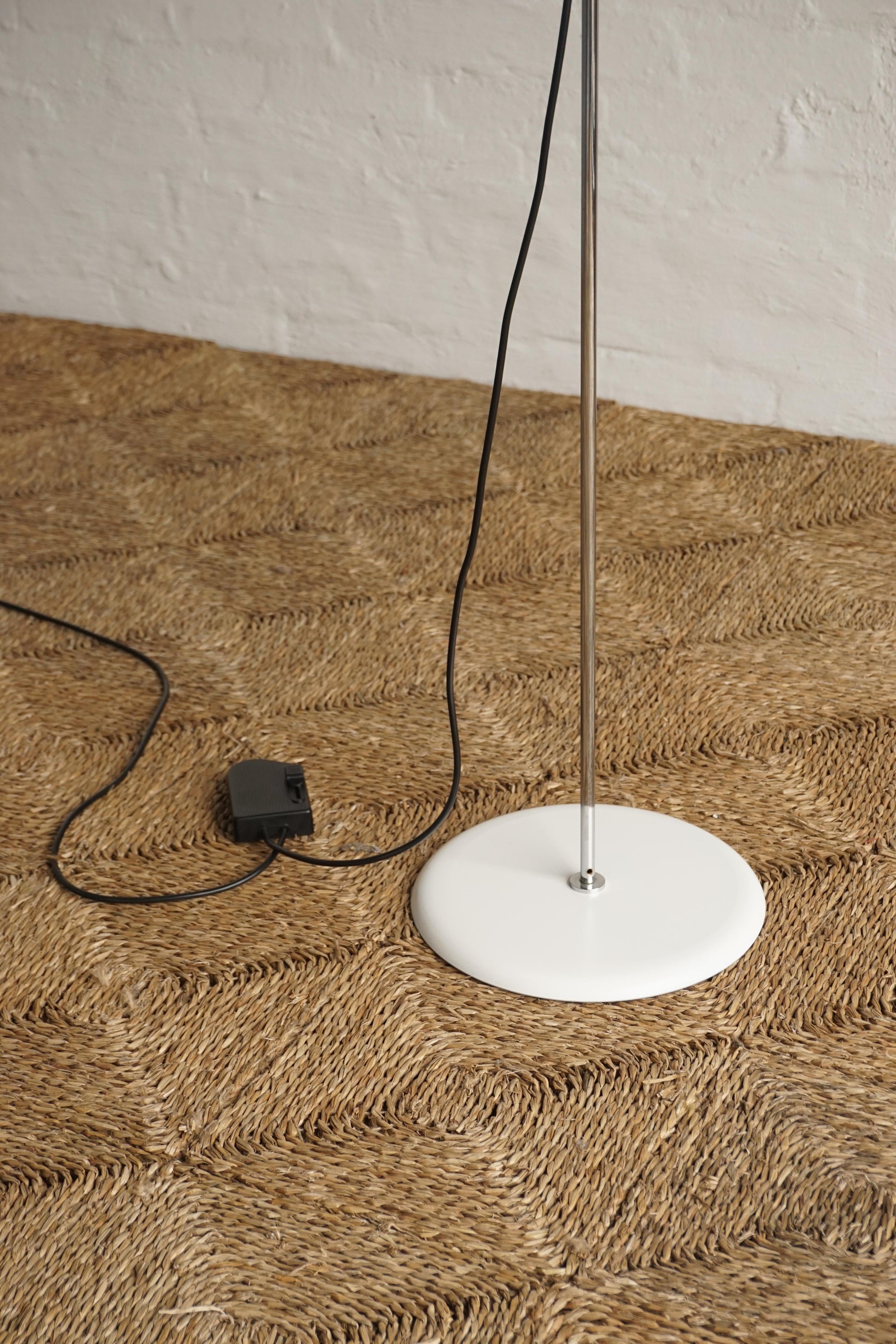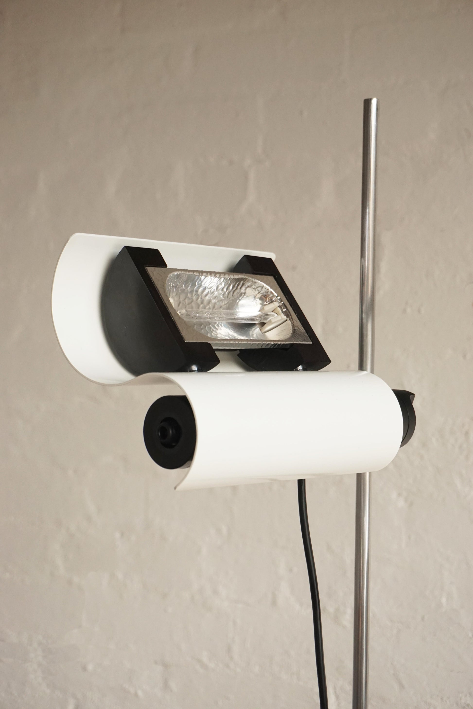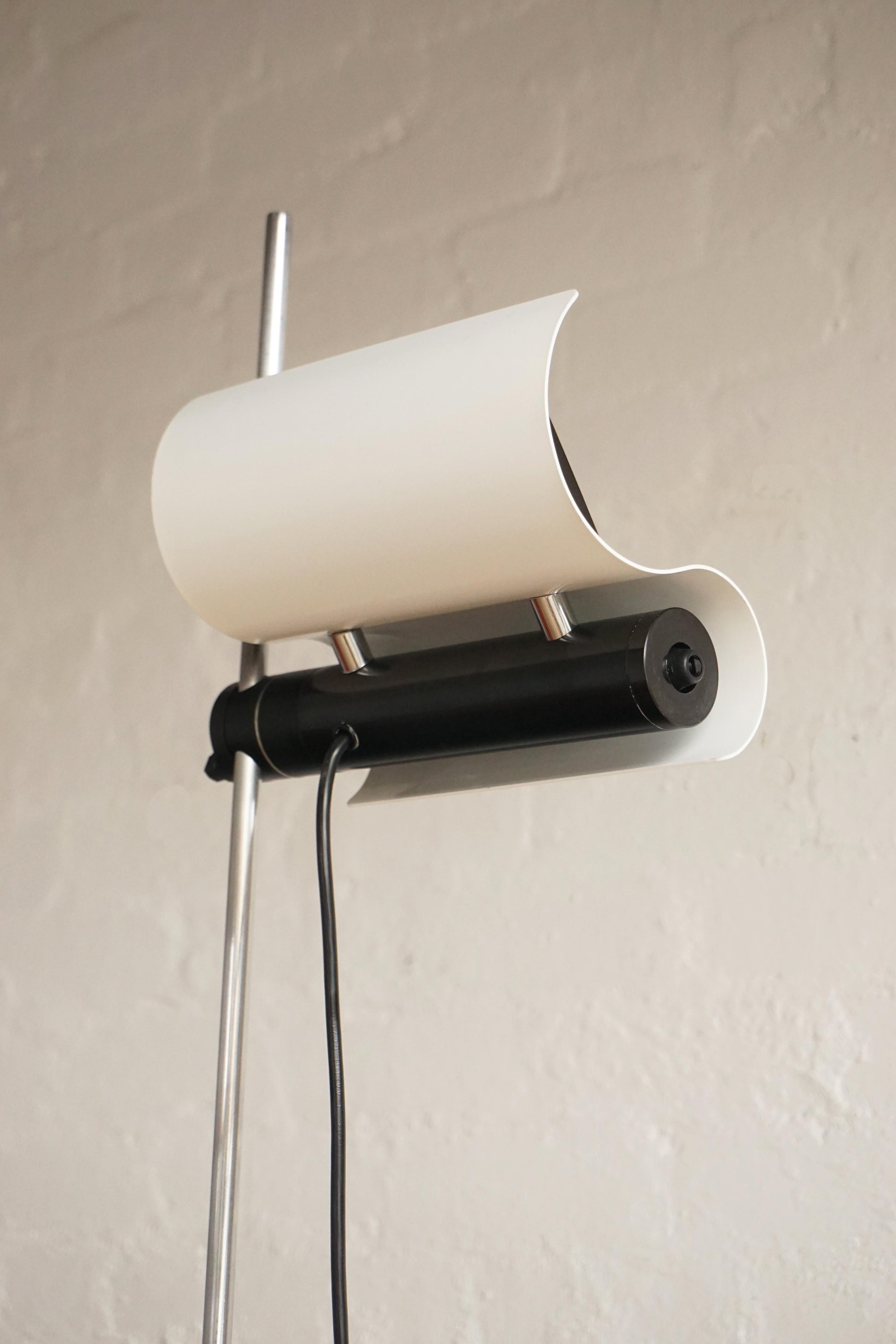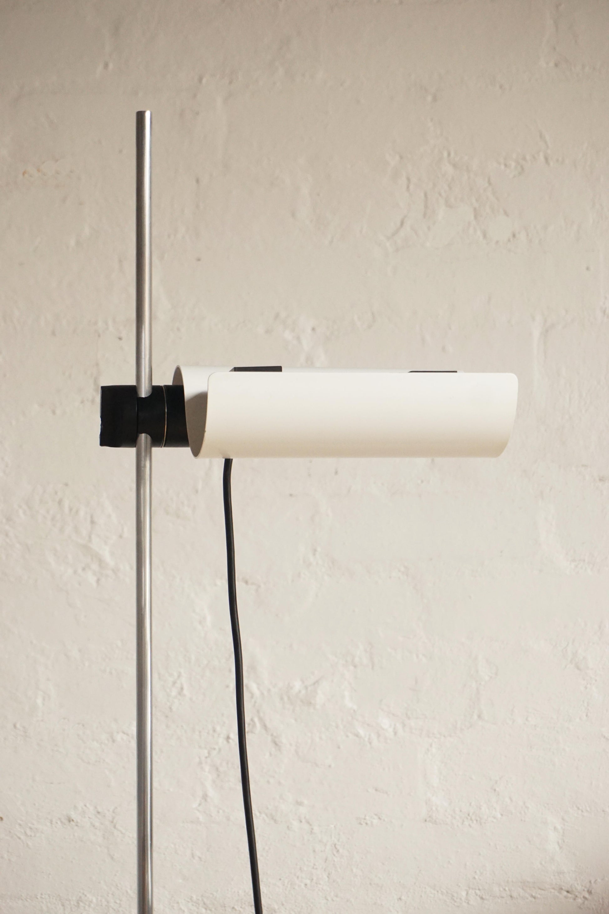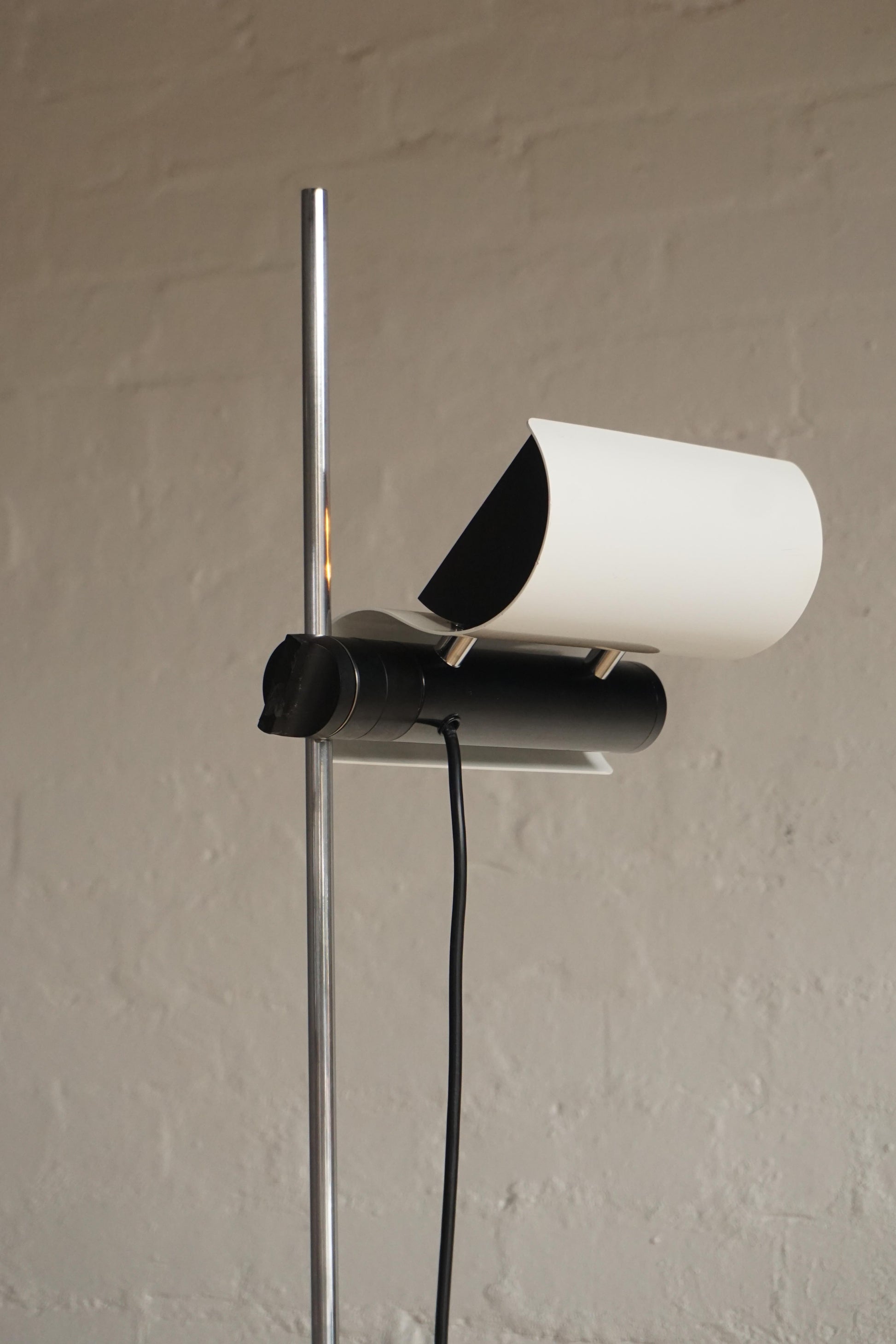 The 'Dim' floor lamp was designed by Vico Magistretti for Oluce, Milan c.1977 Italy. Chrome stem. White lacquered base and shade. Height adjustable and directional shade. Dimmable floor switch. Fully rewired to Australian Standard.