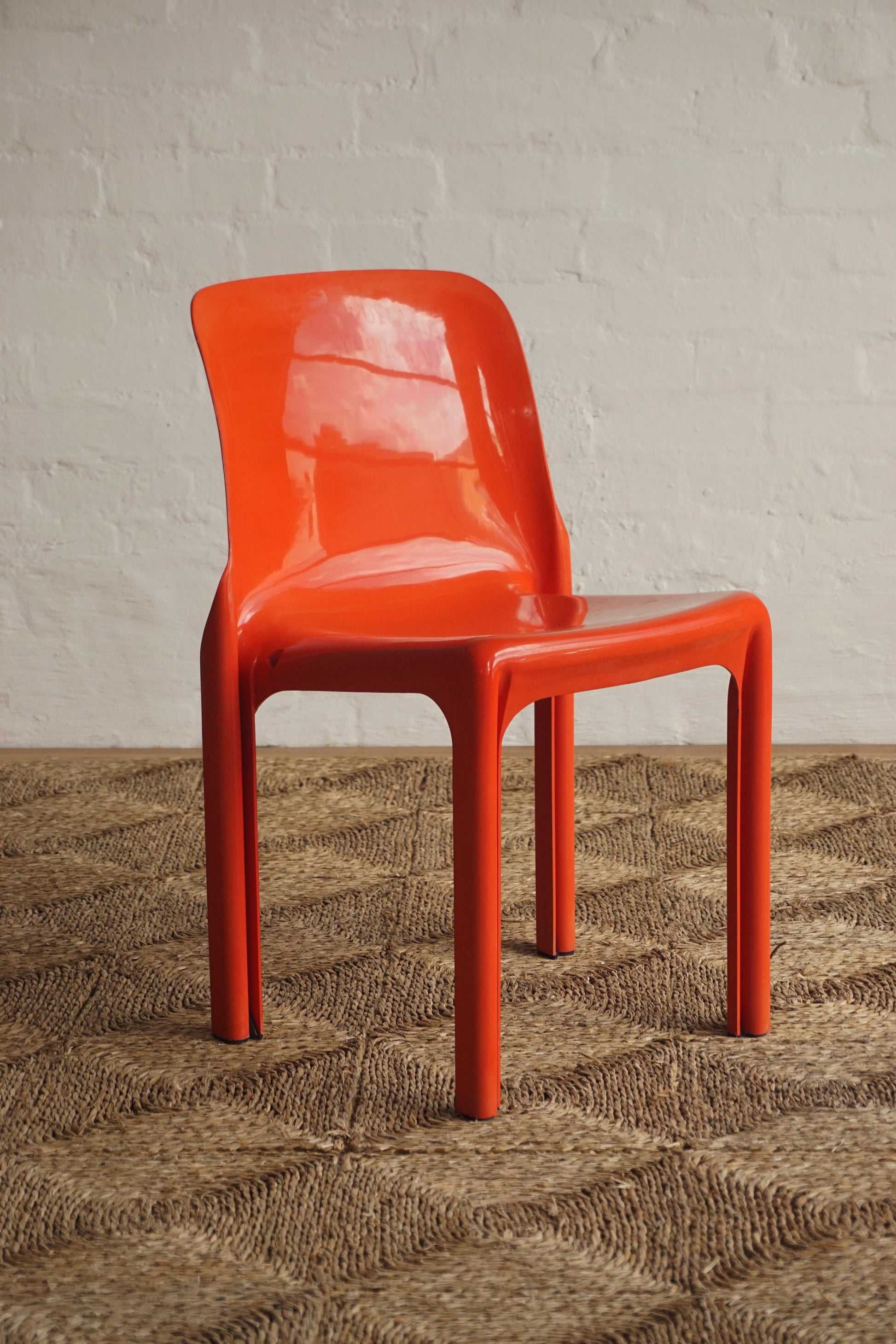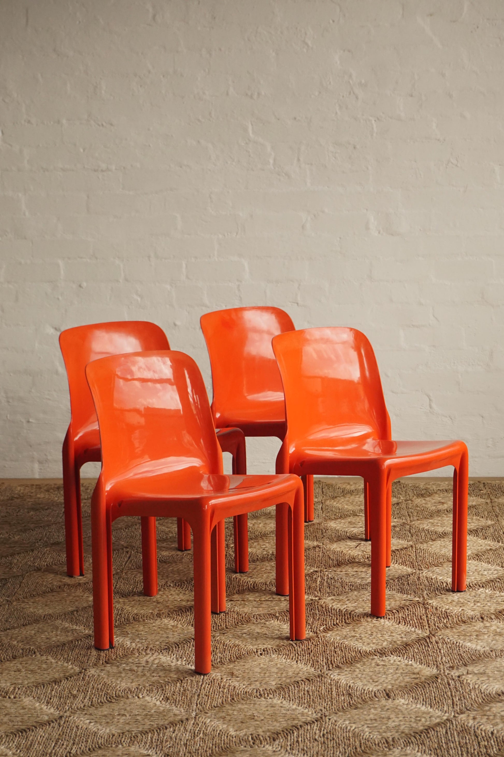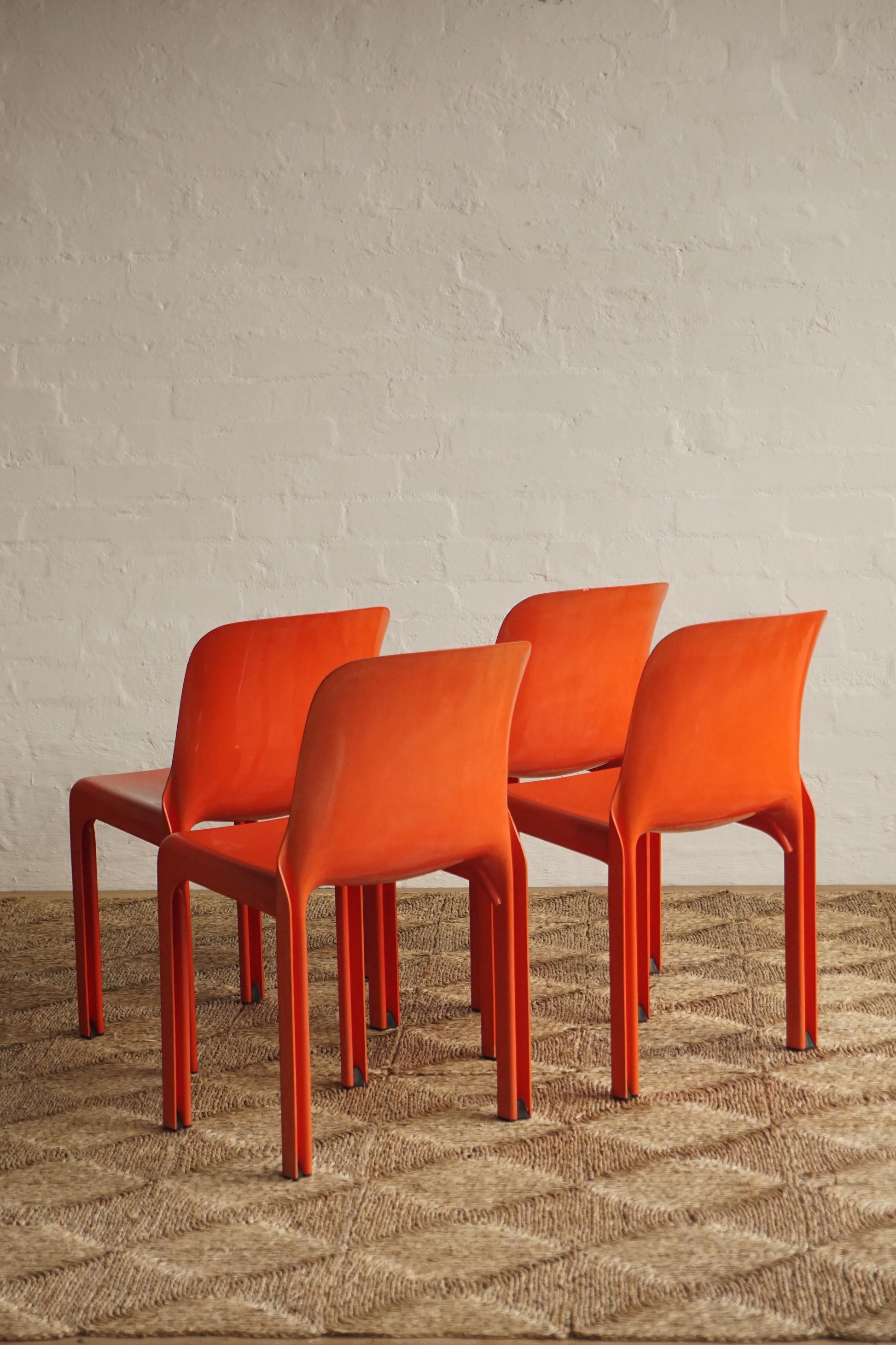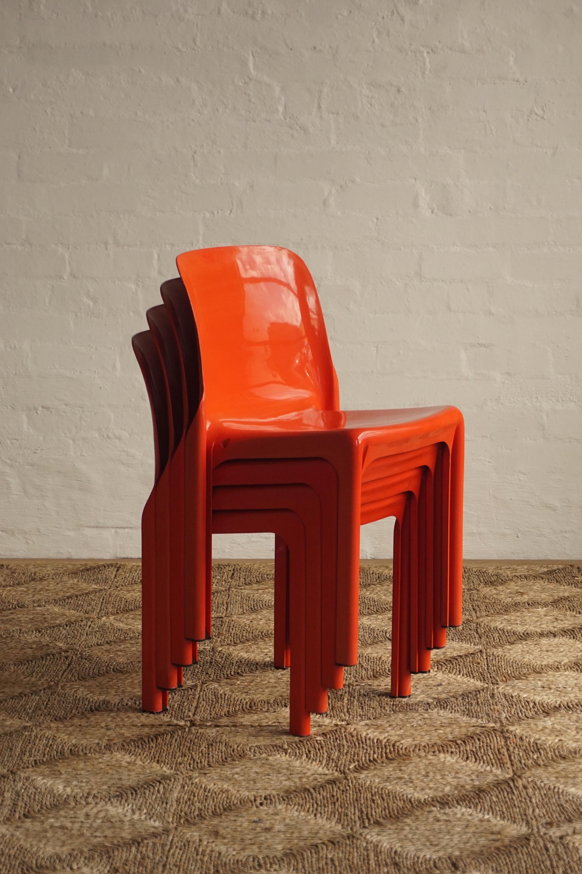 Set of four red 'Selene' chairs designed by Vico Magistretti for Artemide 1968, Italy. An icon of the Italian 1960s design movement. Stackable.